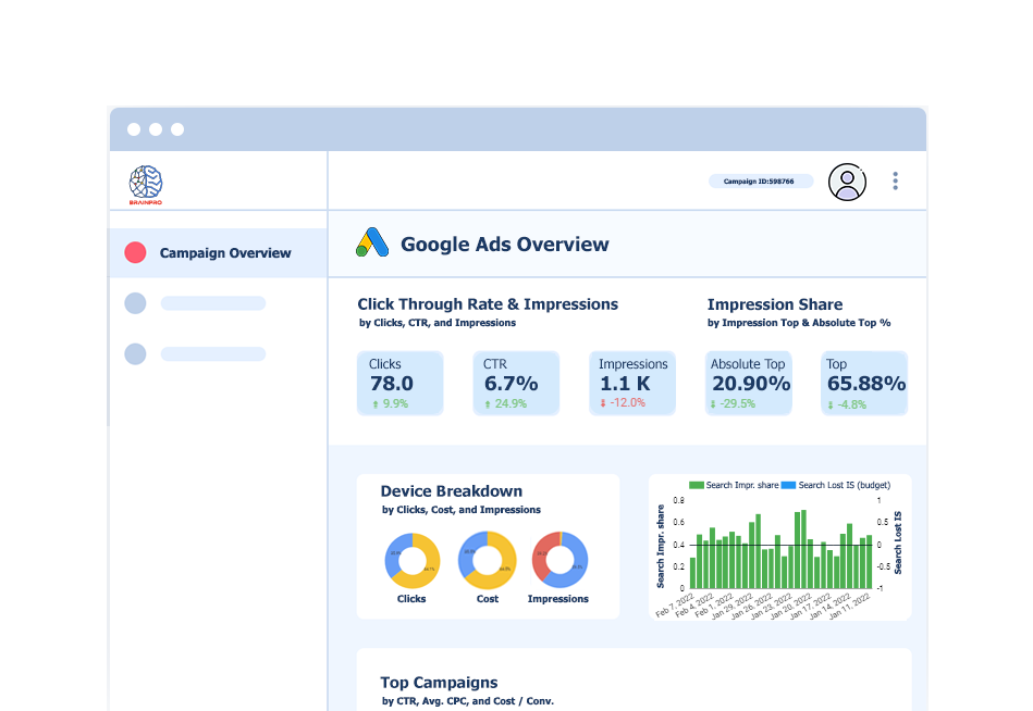 BrainPro will work with you to create and manage a Google Ads campaign that achieves your business goals while maintaining a sensible budget.